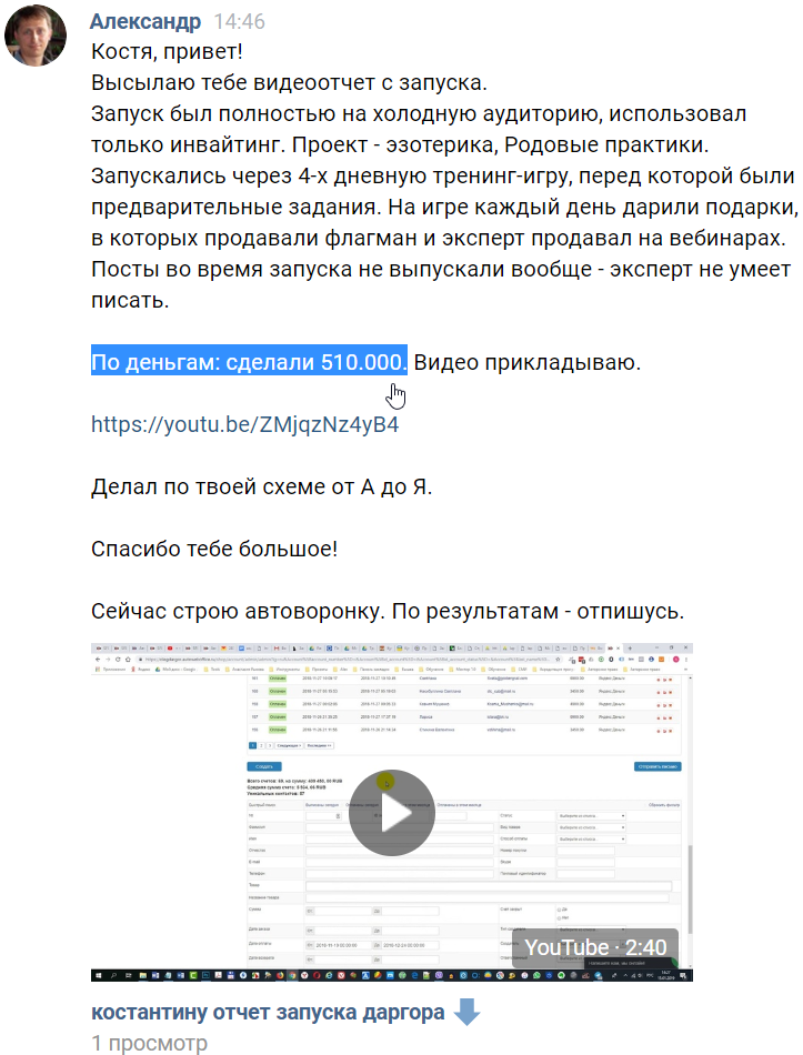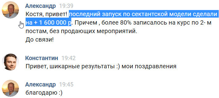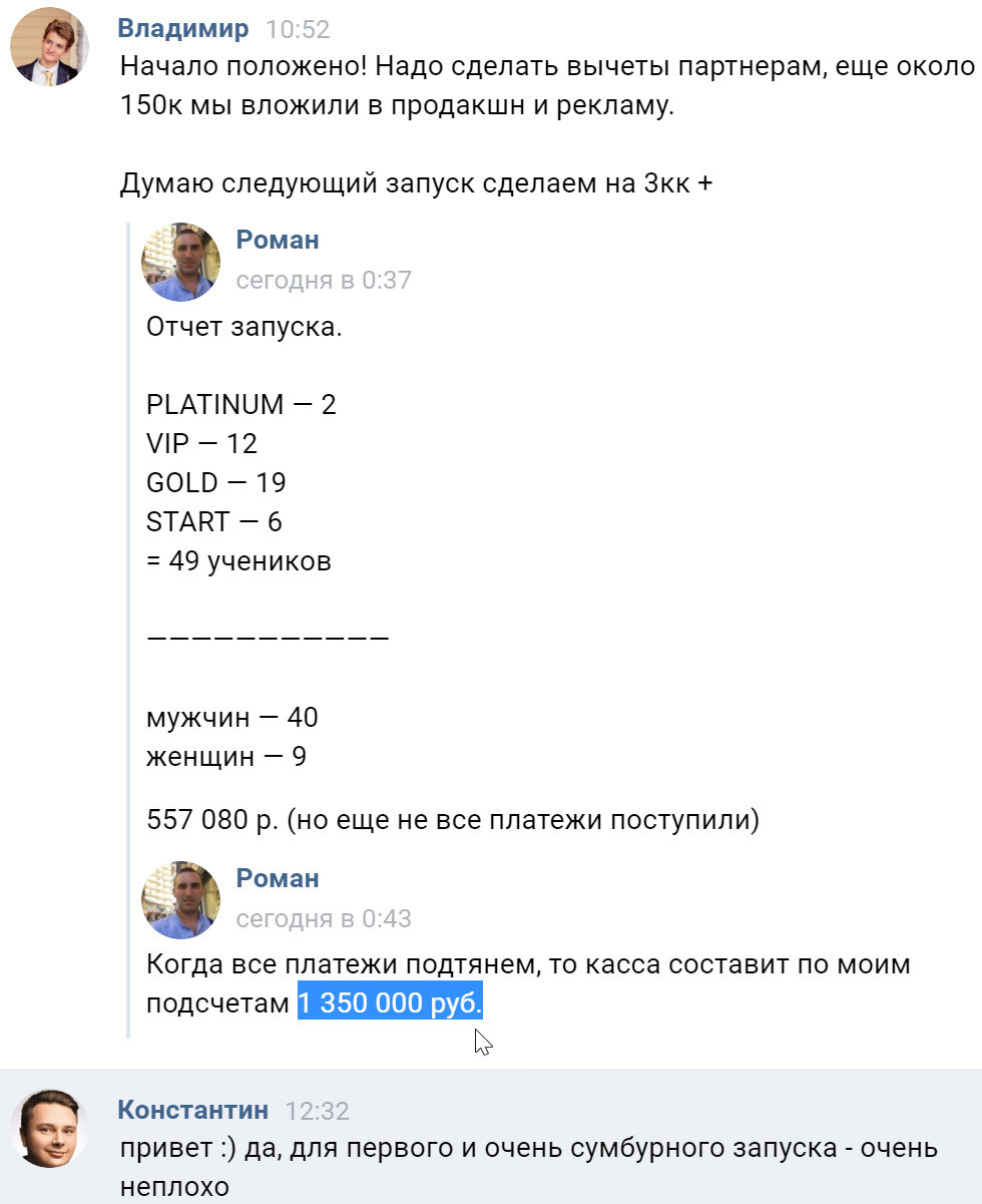 Результат: 140 человек на тренинг со средним чеком в 16 тысяч рублей (это 2 миллиона 240 тысяч рублей)