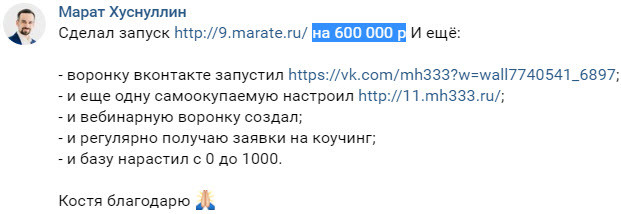 Результат: 300 человек на 2 тренинга за 2 недели, чистая прибыль = 230 000 рублей
