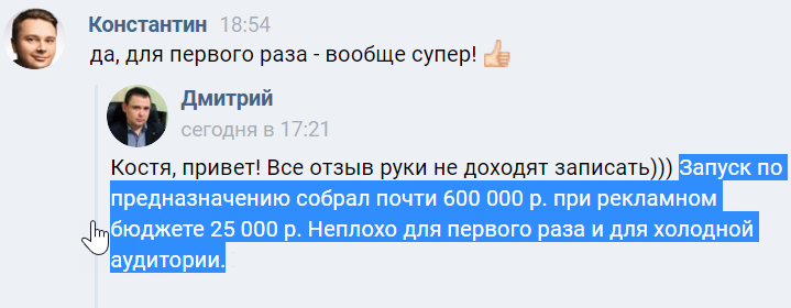 Результат = 600 тысяч рублей при рекламном бюджете 25 000 рублей (1 месяц), а затем в одном из следующих запусков